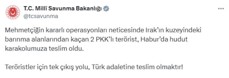 Milli Savunma Bakanlığı, Irak'ın kuzeyindeki barınma alanlarından kaçan 2 PKK'lı teröristin Habur'daki hudut karakoluna teslim olduğunu duyurdu..