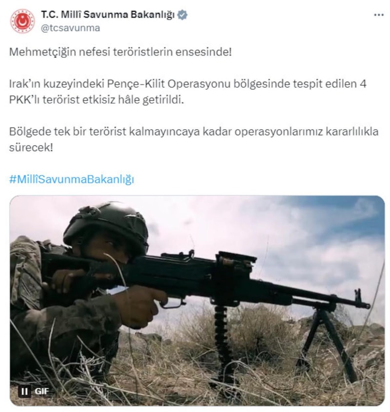 Milli Savunma Bakanlığı, Pençe Kilit Operasyonu bölgesinde 4 PKK'lı teröristin etkisiz hale getirildiğini duyurdu.