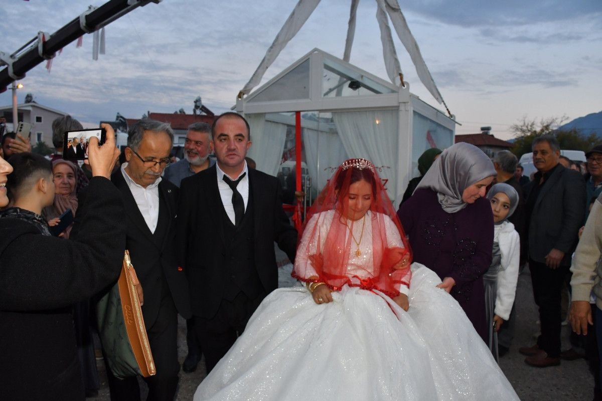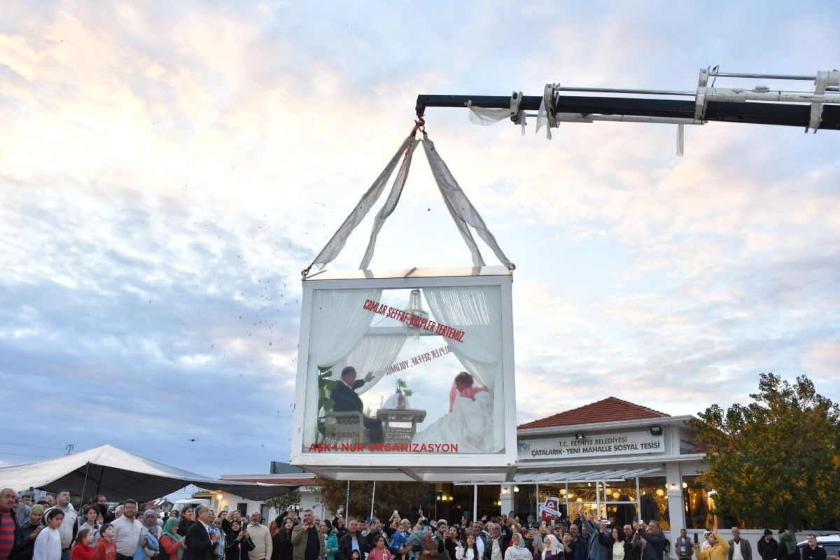 Masa, sandalye ve çiçeklerle süslenen cam vitrinin içine giren gelin Merve Sarıman ile damat Berat Çetinkaya, tıra yüklenerek gelin alma töreni için yola çıktı. Kız evinde dualarla cam vitrinin içine giren çift, vinç yardımıyla tekrar tıra alındı. Konvoy eşliğinde Seydikemer’den Fethiye’ye hareket eden tır, güzergâh boyunca vatandaşların yoğun ilgisini çekti.