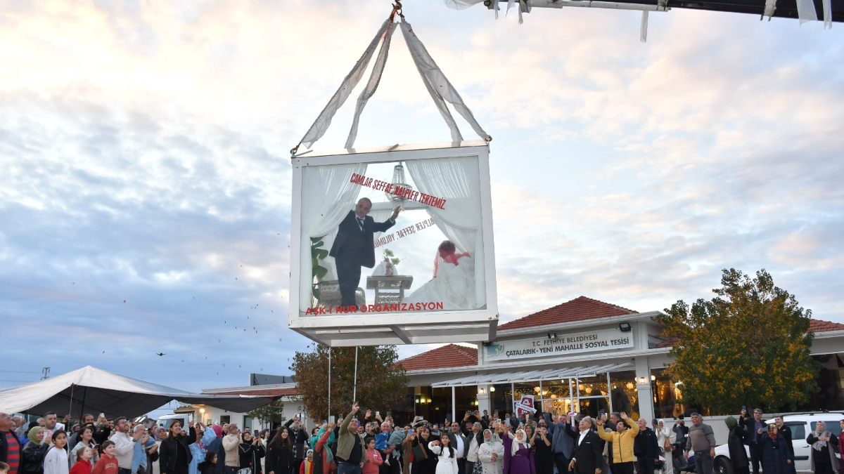 Çift, Çatalarık Mahallesi sosyal tesislerindeki düğün salonuna ulaştığında davetliler tarafından alkışlarla karşılandı. Cam vitrindeki gelin ve damat, burada da vinç yardımıyla tırdan indirilerek salona alındı. Düğün törenine siyaset, esnaf ve iş dünyasından çok sayıda davetli katıldı.