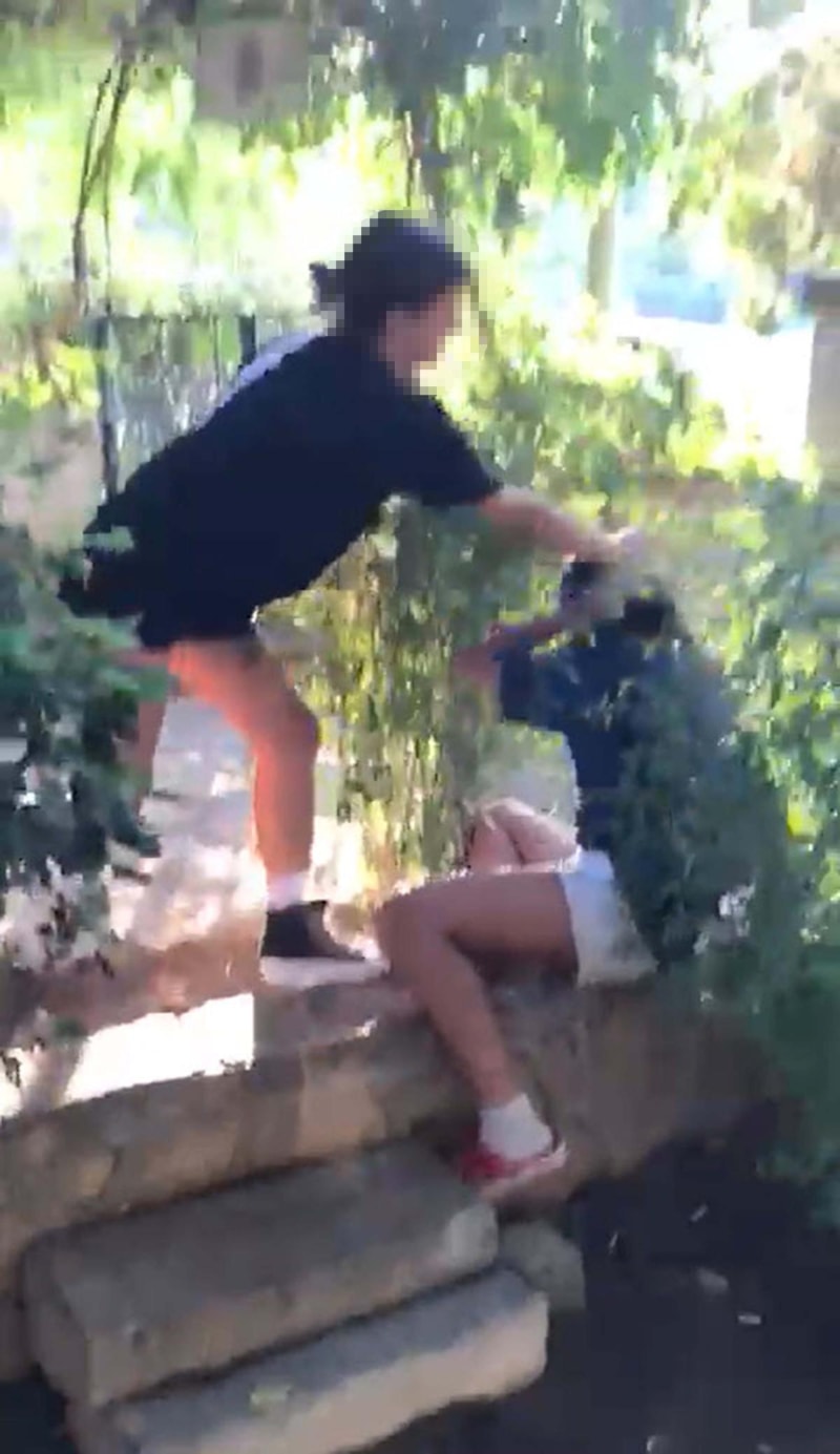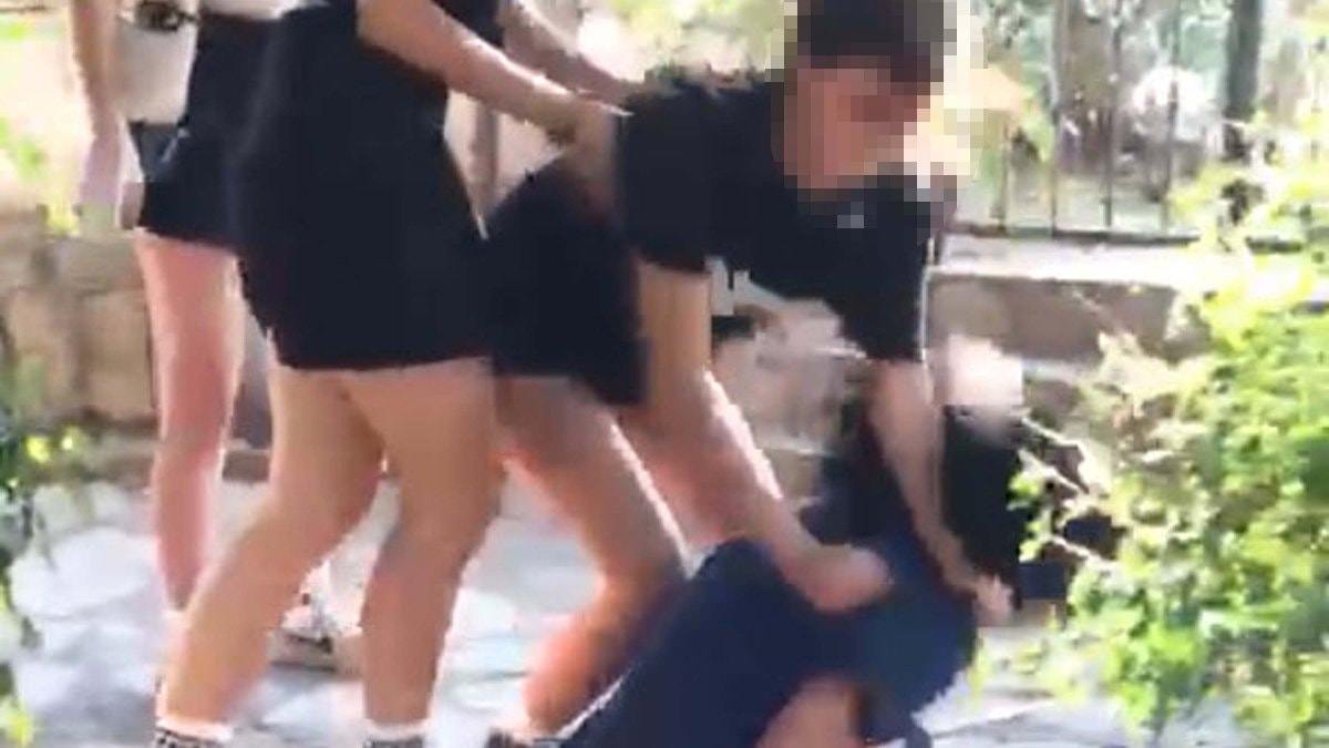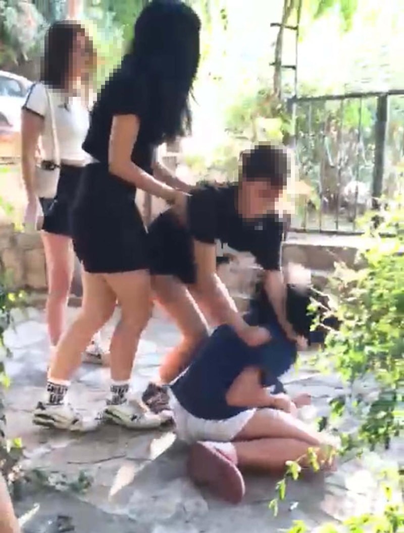 Görüntülerde T.N.K.'nin, F.K.'ye hakaret ettikten sonra saçından tutup, yere yatırdığı, tekmelediği ve yumruk attığı, arkadaşlarının da destek olduğu görülüyor.