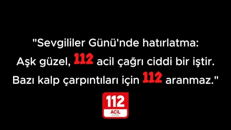112 Acil Çağrı Merkezi yetkilileri, "Sevgililer Günü'nde hatırlatma" uyarısı yaparak, "Aşk güzel, 112 Acil Çağrı ciddi bir iştir. Bazı kalp çarpıntıları için 112 aranmaz" notu düştü.