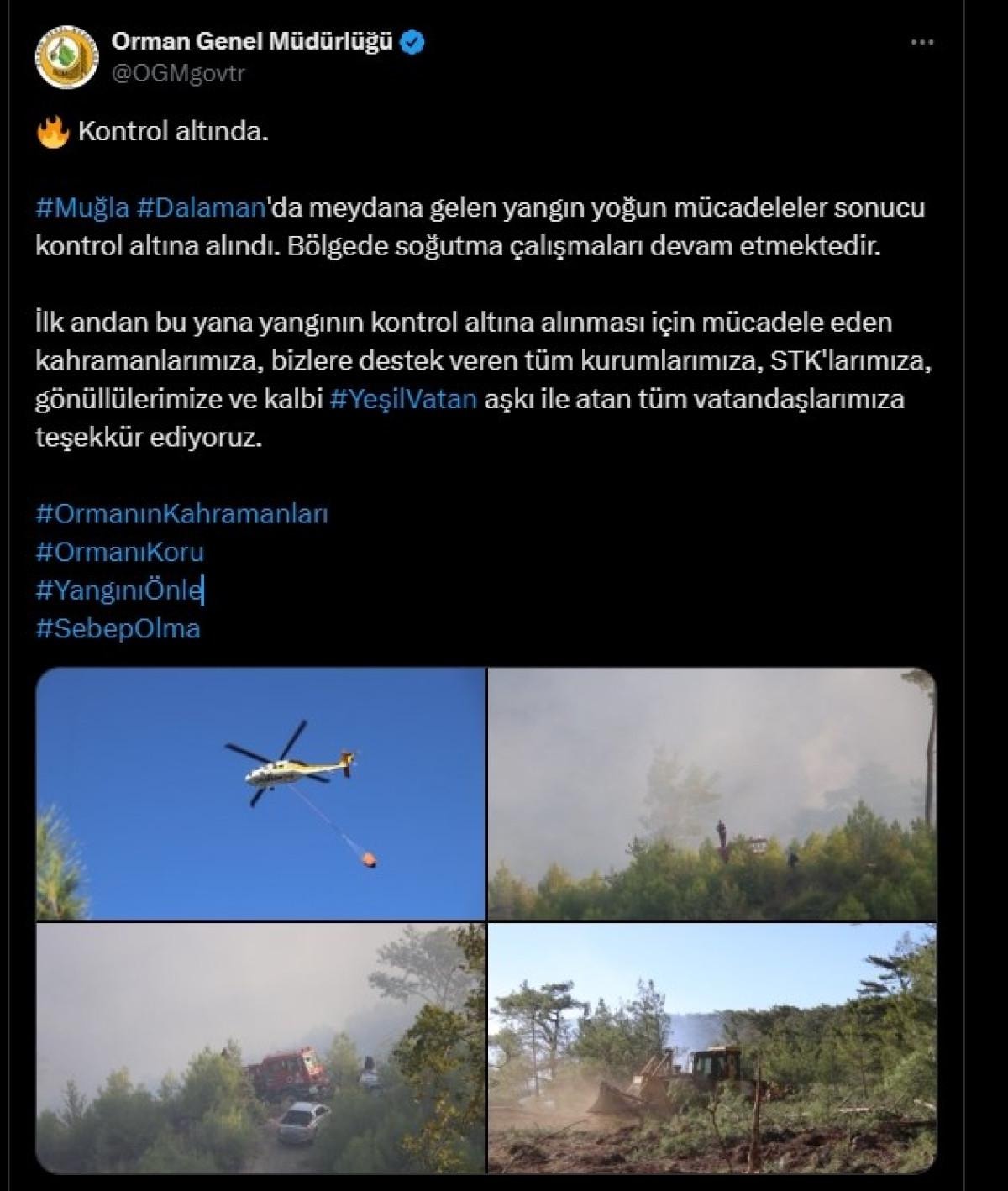 Muğla Dalaman'da meydana gelen yangın yoğun mücadeleler sonucu kontrol altına alındı. Bölgede soğutma çalışmaları devam etmektedir. İlk andan bu yana yangının kontrol altına alınması için mücadele eden kahramanlarımıza, bizlere destek veren tüm kurumlarımıza, STK'larımıza, gönüllülerimize ve kalbi yeşil vatan aşkı ile atan tüm vatandaşlarımıza teşekkür ediyoruz.