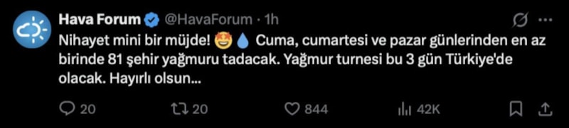 “Cuma, cumartesi ve pazar günlerinden en az birinde 81 şehir yağmuru tadacak. Yağmur turnesi bu 3 gün Türkiye'de olacak. Hayırlı olsun…”