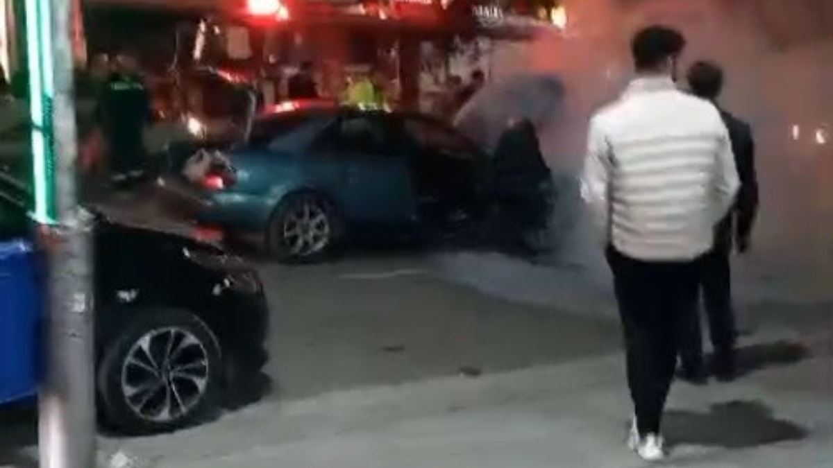 Sürücü, can havliyle kendini araçtan dışarı atarak yaralanmaktan son anda kurtulurken, yangını fark eden vatandaşlar ise olayı cep telefonlarıyla anbean kayda aldı.