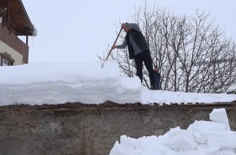 Karın ağırlığının yapılarda hasara yol açmasından endişe eden mahalle sakinleri, sabahın erken saatlerinden itibaren küreklerle damlara çıkarak temizlik yaptı. Vatandaşlar, büyük bir dikkatle biriken karları çatıdan aşağı indirerek olası çökmelerin önüne geçmeye çalıştı.