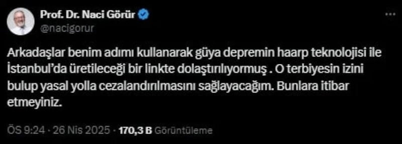 “Arkadaşlar, benim adımı kullanarak güya depremin HAARP teknolojisi ile İstanbul’da üretileceği bir linkte dolaştırılıyormuş. O terbiyesizin izini bulup yasal yolla cezalandırılmasını sağlayacağım. Bunlara itibar etmeyiniz”