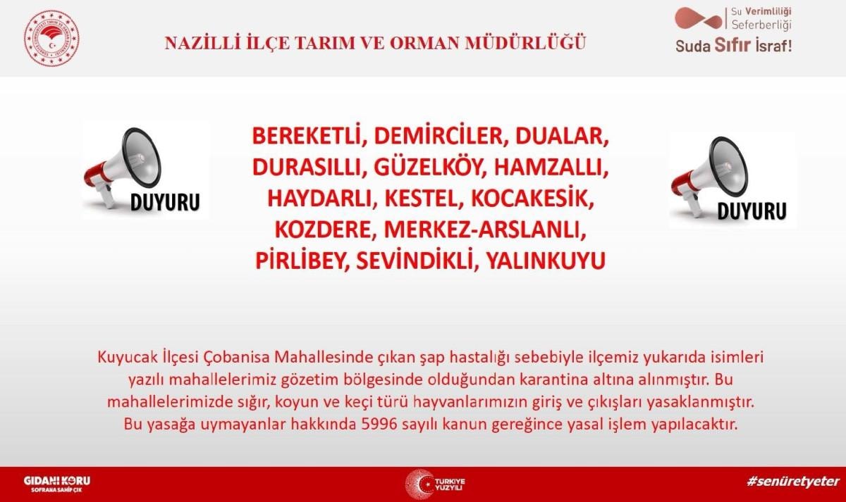 Şap hastalığı nedeniyle gözetim bölgesinde bulunan Nazilli’ye bağlı 14 mahalle, karantina altına alındı. Nazilli İlçe Tarım ve Orman Müdürlüğü’nün kararıyla Bereketli, Demirciler, Dualar, Durasıllı, Güzelköy, Hamzallı, Haydarlı, Kestel, Kocakesik, Kozdere, Merkez Arslanlı, Pirlibey, Sevindikli ve Yalınkuyu mahallelerinde, hayvan giriş çıkışları yasaklandı.