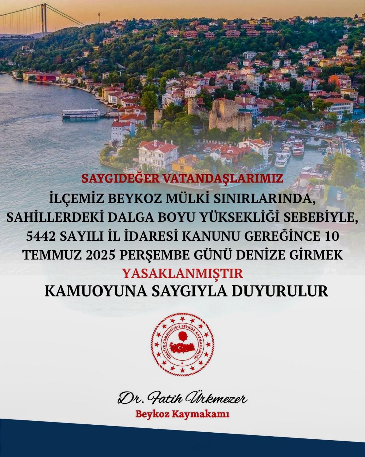 Beykoz Kaymakamlığı, ilçede dalga boyu yüksekliği nedeniyle 10 Temmuz 2025 Perşembe günü denize girmenin yasaklandığını duyurdu.