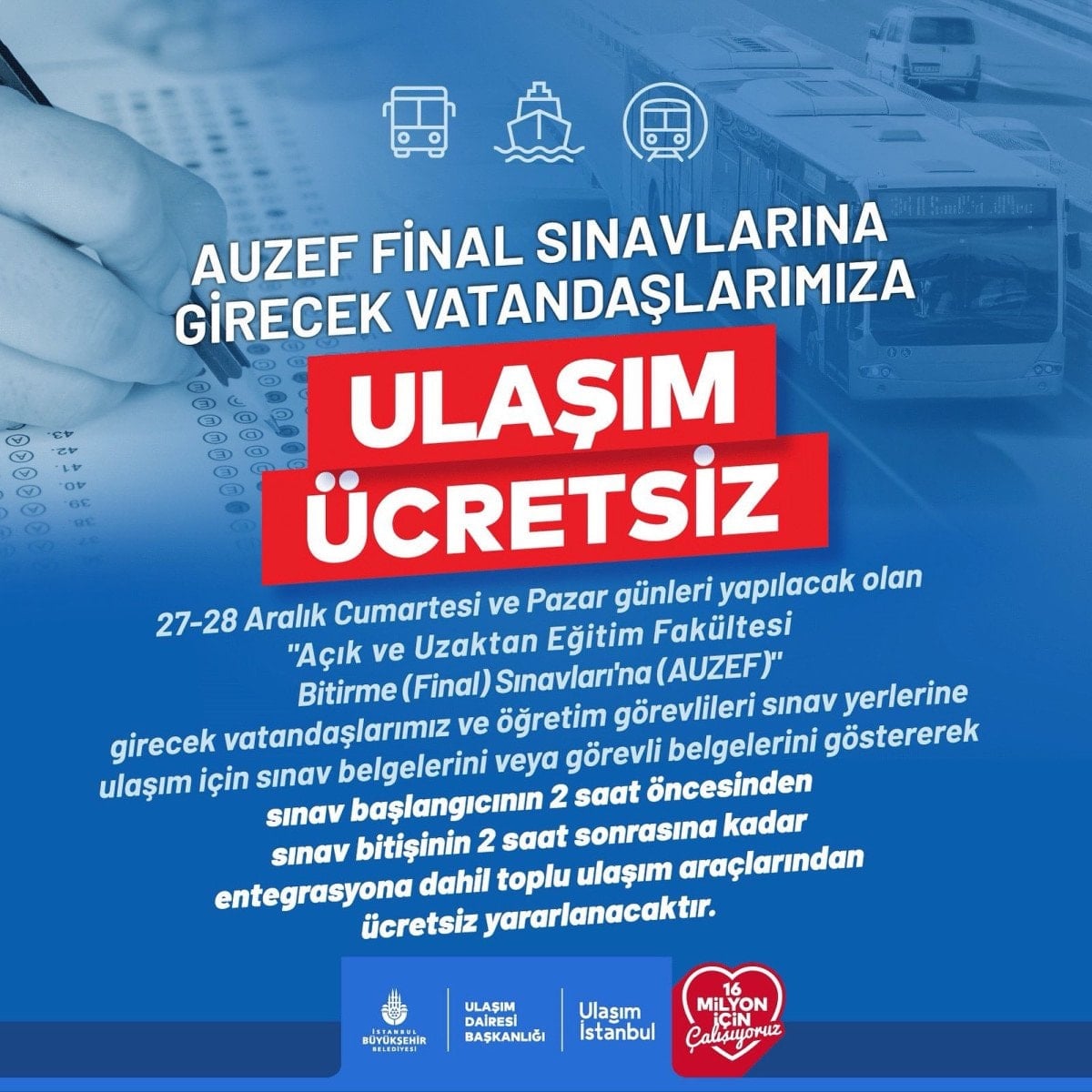 - Hafta sonu yapılacak açıköğretim final sınavları öncesinde öğrencilere ücretsiz toplu taşıma imkanı sağlanacak.