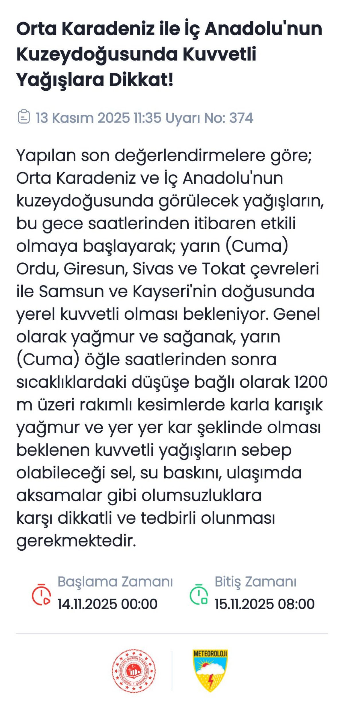 - Meteoroloji Genel Müdürlüğü, Ordu, Giresun, Sivas ve Tokat için kuvvetli yağış uyarısında bulundu.