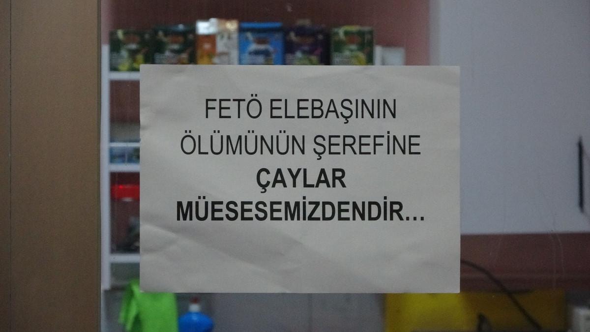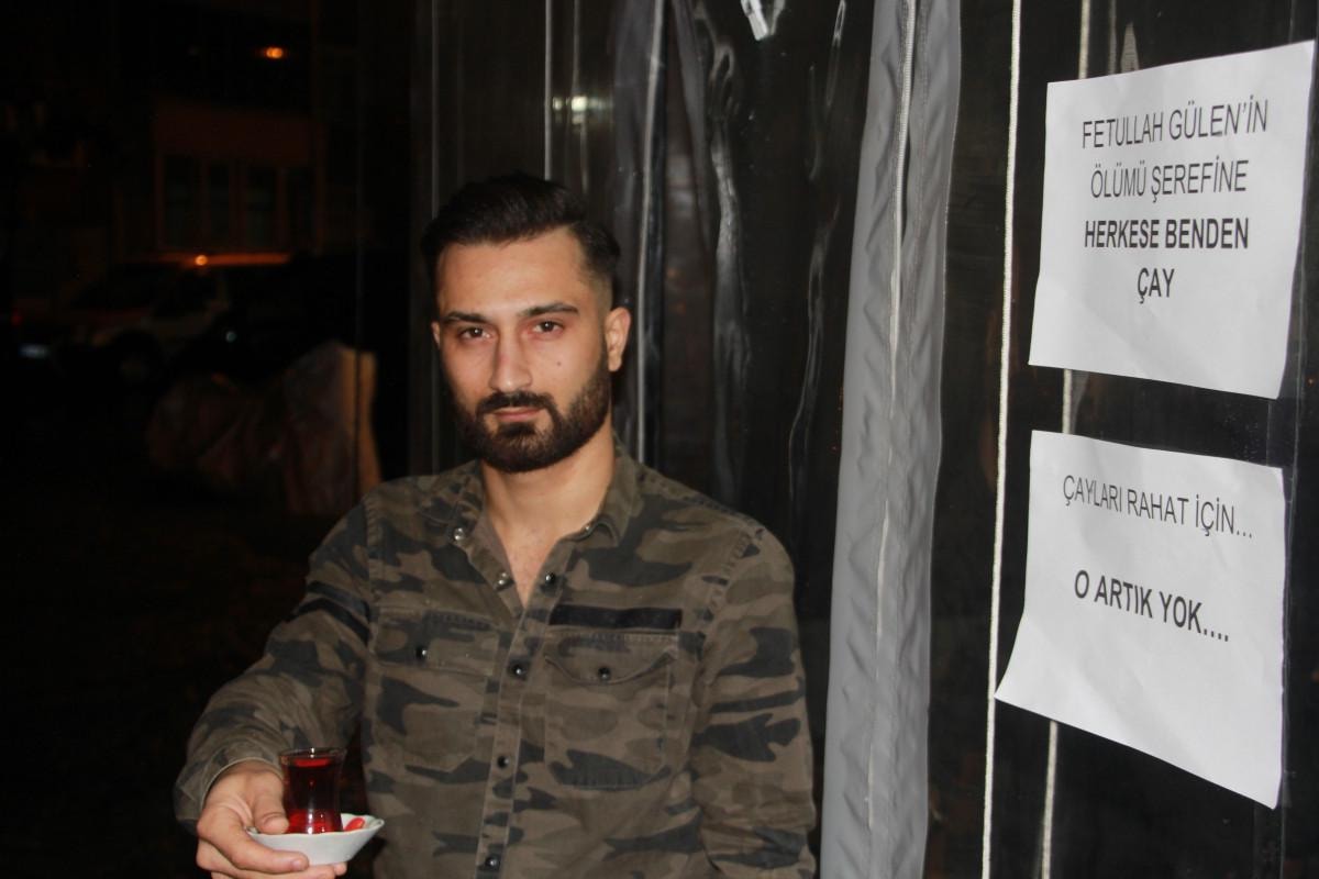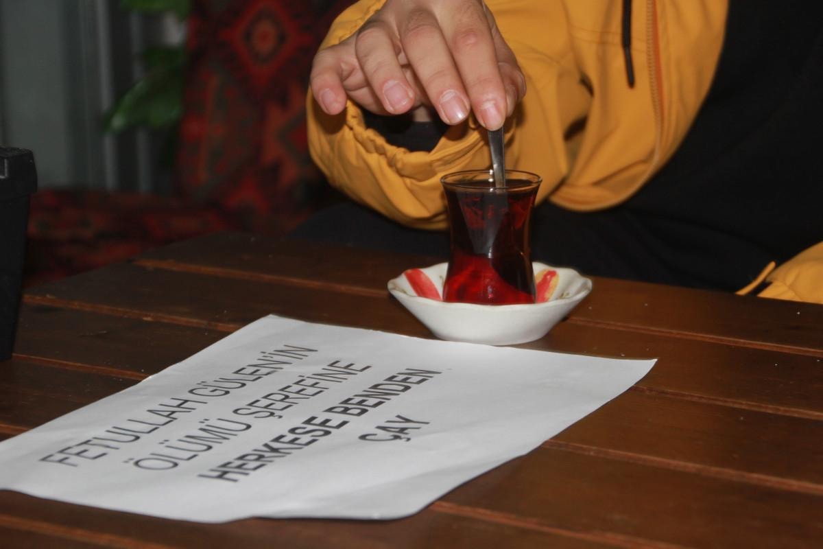 İş yerinin camına ve masasına 'Fetullah Gülen'in ölümü şerefine herkese benden çay' yazan Temel, gün boyunca müşterilerine sınırlı sayıda çayı ücretsiz verdi.