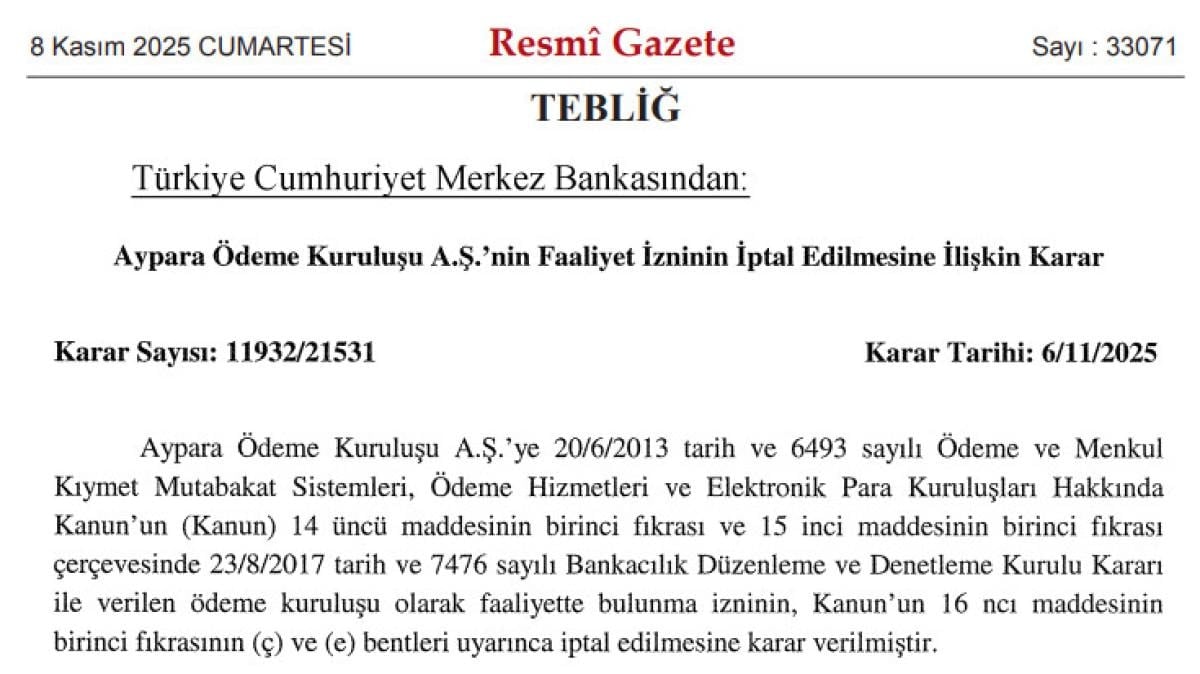 Merkez Bankası’nın Resmi Gazete’de duyurduğu yeni karara göre, Pay Fix, İninal ve Aypara’nın işleyiş izinleri sonlandırıldı.