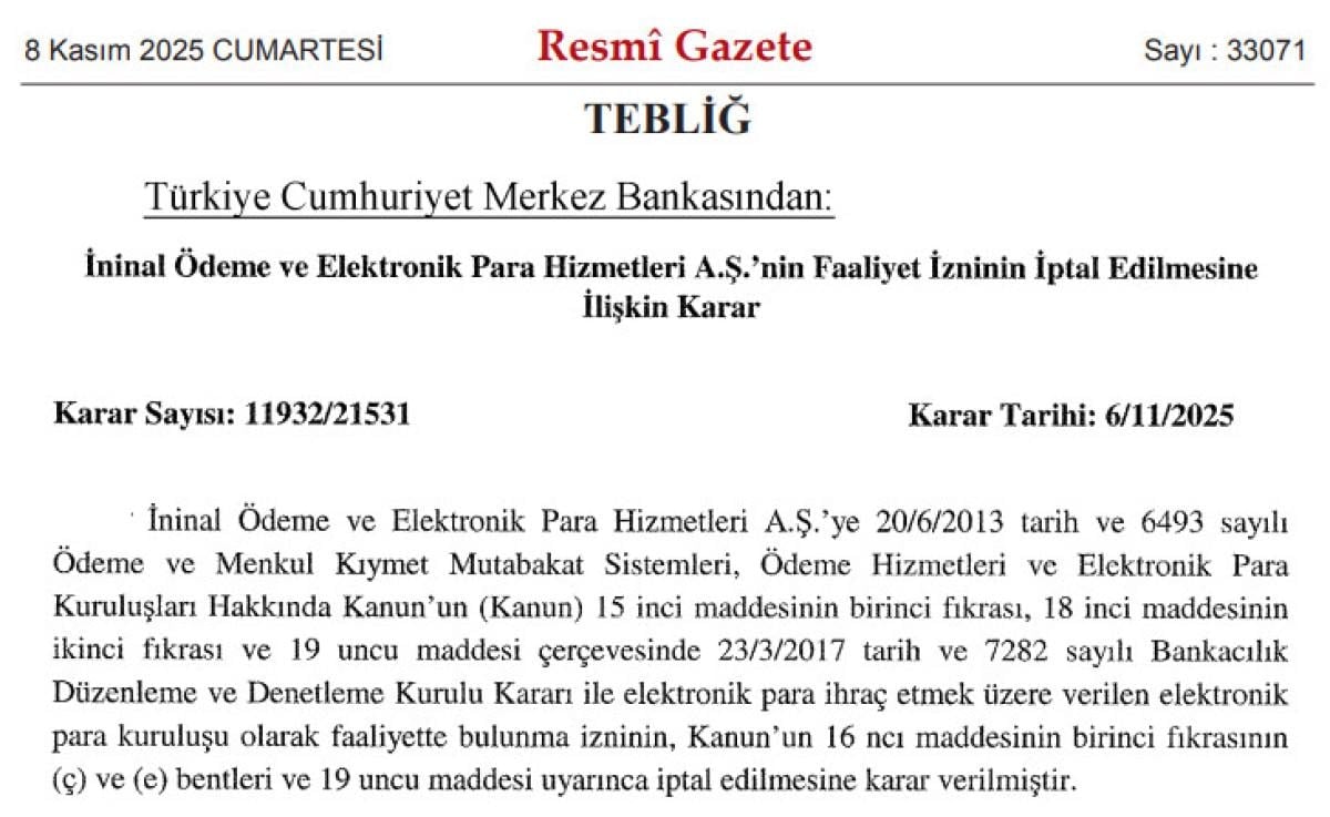 Pay Fix Elektronik Para ve Ödeme Hizmetleri A.Ş., İninal Ödeme ve Elektronik Para ve Hizmetleri A.Ş. ile Aypara Ödeme Kuruluşu A.Ş.’nin faaliyet izinlerinin iptali, Merkez Bankası tarafından yapılan tebliğ ile birlikte kamuoyuna aktarıldı.