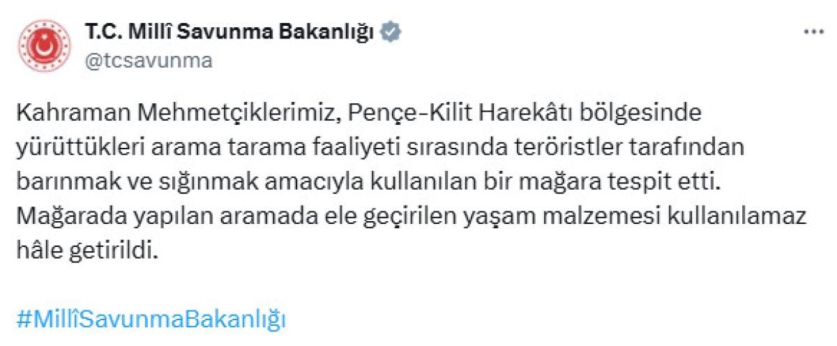 Milli Savunma Bakanlığı'ndan yapılan açıklamada Pençe-Kilit Operasyonu bölgesinde teröristlere ait mağaranın içindeki yaşam malzemelerin kullanılamaz hale getirildiği belirtildi..
