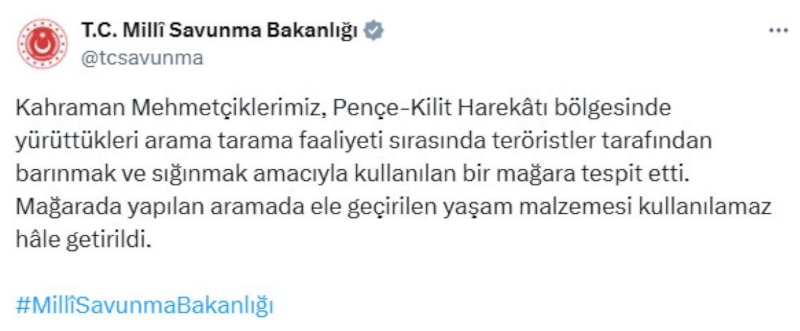 Milli Savunma Bakanlığı (MSB), Pençe-Kilit Operasyonu bölgesinde tespit edilen teröristlerin kullandığı mağaranın imha edildiğini duyurdu.