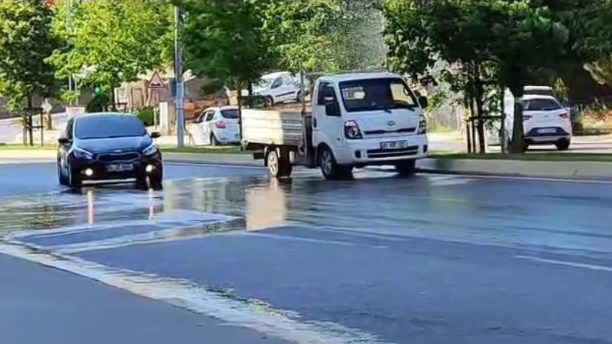 Patlayan borudan su yola ve çevreye yayıldı.