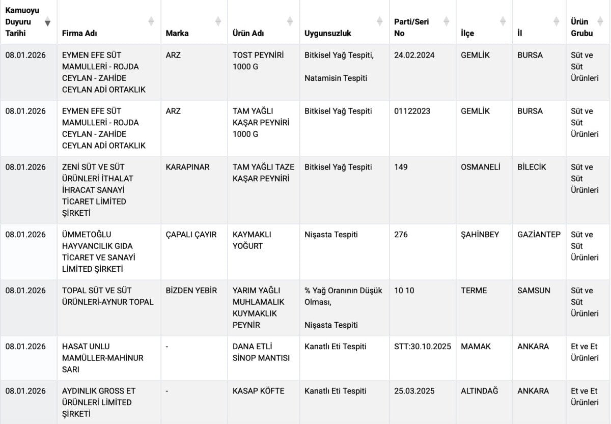 Güncellenen listede, günlük tüketimde sıkça yer alan bazı ürün gruplarında mevzuata aykırı uygulamaların tespit edildiği belirtildi.
