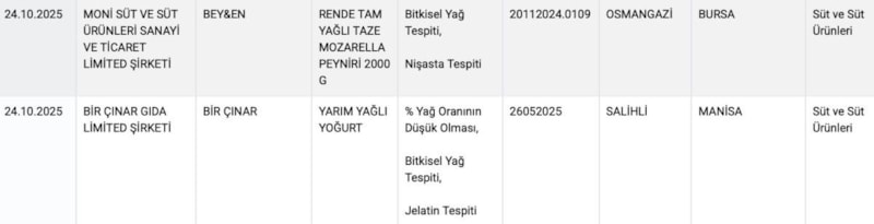 Ayrıca, Bir Çınar markalı yarım yağlı yoğurt ürününde de bitkisel yağ ve jelatin bulunduğu açıklandı.