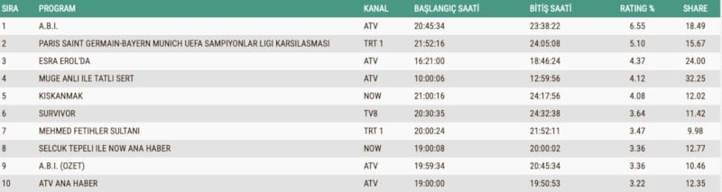 Üçüncü sırada ise gündüz kuşağından Esra Erol'da programı yer aldı.