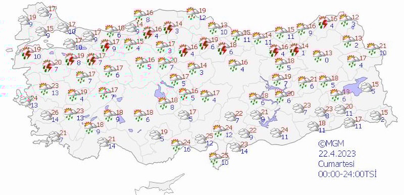 Bayramın ikinci günü cumartesi Osmaniye, Adana'nın kuzey kesimleri ve Hatay'ın kıyı kesimleri, Kahramanmaraş'ın batısında yağışlar var. Deprem bölgesinin geri kalanında yağış beklemiyoruz, sabah parçalı bulutlu, öğleden sonra çok bulutlu olacak. Bayramın üçüncü günü ise yine Hatay'ın kıyı kesimleri, Osmaniye, Adana'nın doğusu ve kuzeyi Kahramanmaraş'ın tamamı, Adıyaman, Elazığ, Malatya çevreleri ve Diyarbakır'da sağanak ve gök gürültülü sağanak bekliyoruz.