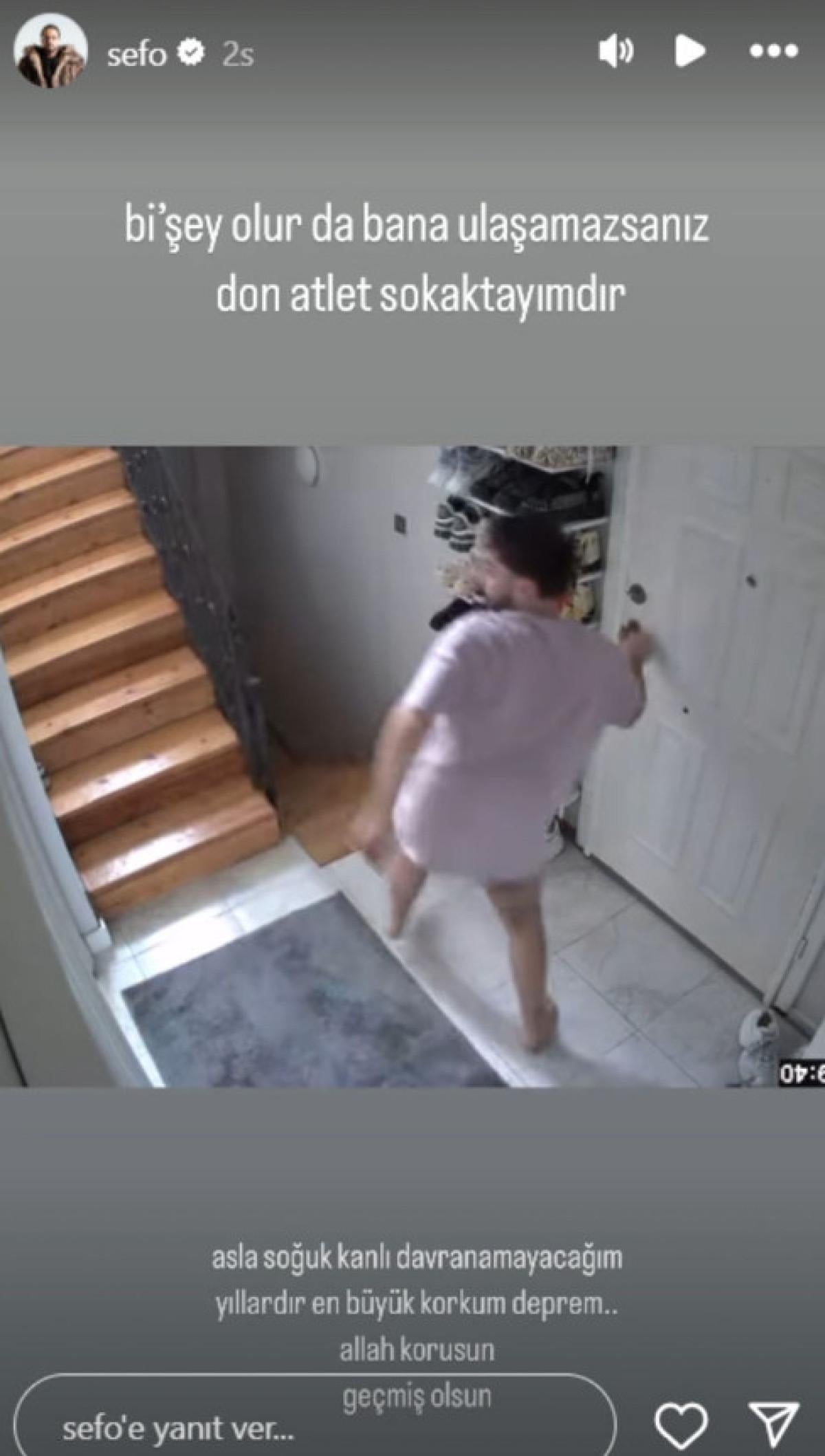 Evine yerleştirdiği güvenlik kameralarına yansıyan görüntülerde, Sefo’nun sarsıntı sırasında yaşadığı panik ve hızla dışarı çıkmaya çalıştığı anlar dikkat çekti.