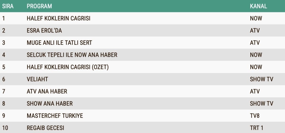 İkinci sırada Esra Erol'da programı, üçüncü sırada Müge Anlı ile Tatlı Sert programı yer aldı.