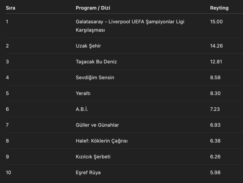 Geçtiğimiz hafta İngiltere devi Liverpool’u 1-0 deviren Galatasaray’ın Avrupa karşılaşması reytinglerde zirveye oturdu.