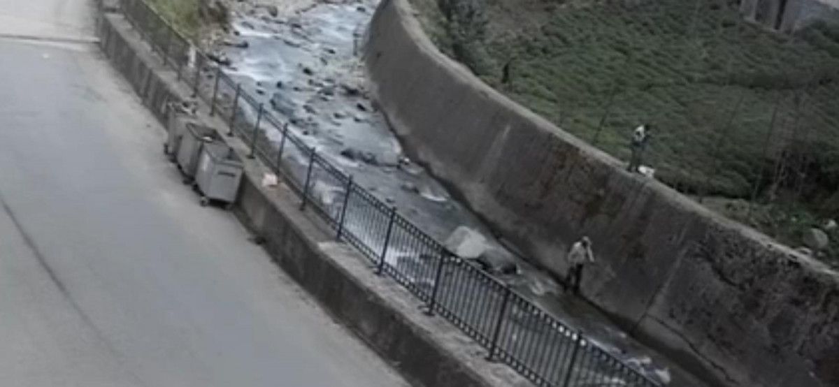 Görüntüde, teleferik telini tutan 2 kişinin, aniden çıkan alev sonrası akıma kapılıp, dereye düştüğü görülüyor.