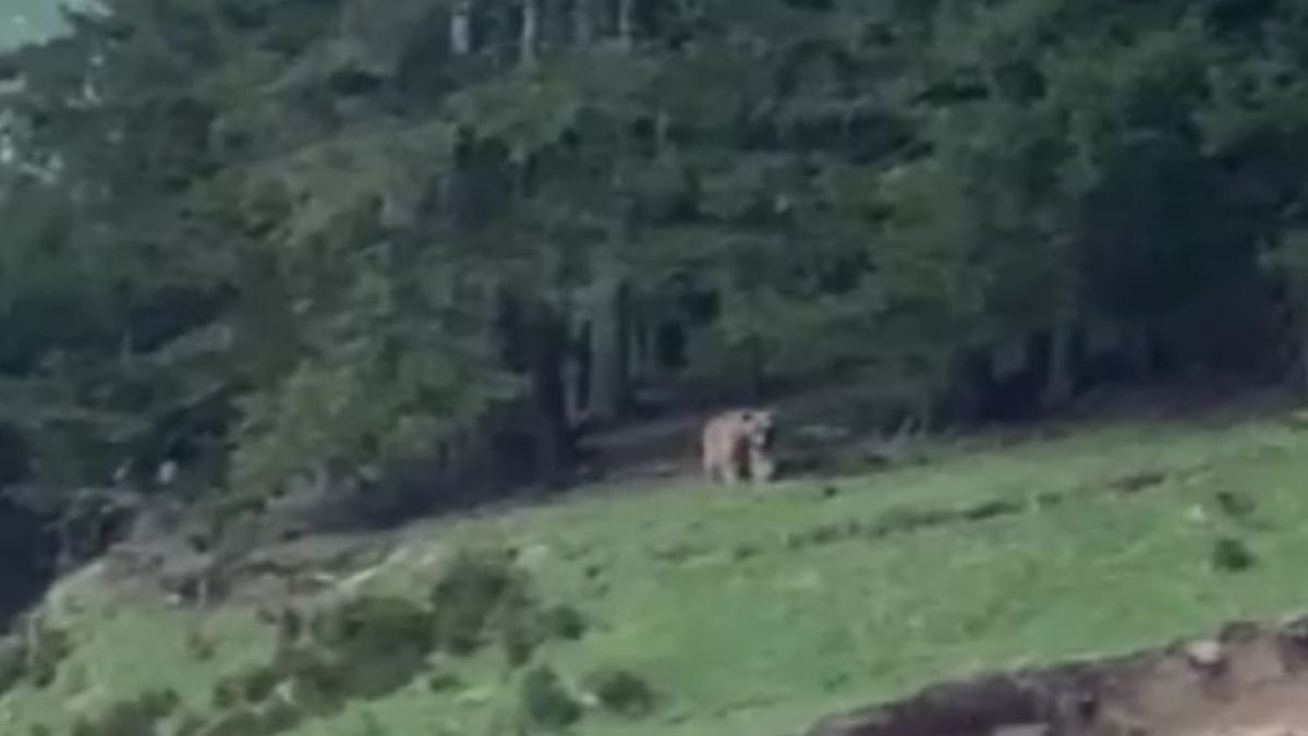 O sırada bölgeden geçen köy muhtarı Aslan Emin Arıcan, ayıyı fark edince cep telefonuyla kayda başladı.