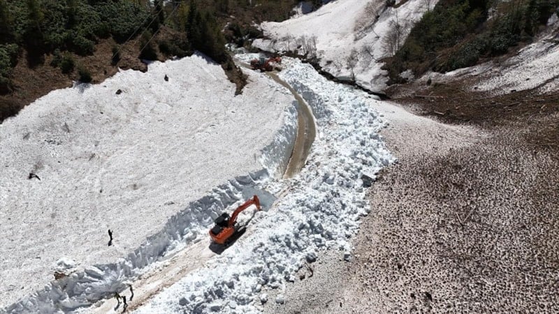 Çamlıhemşin ilçesine bağlı Avusor ve Kavrun yaylaları yollarında iş makineleriyle karla mücadele çalışması devam ediyor.
