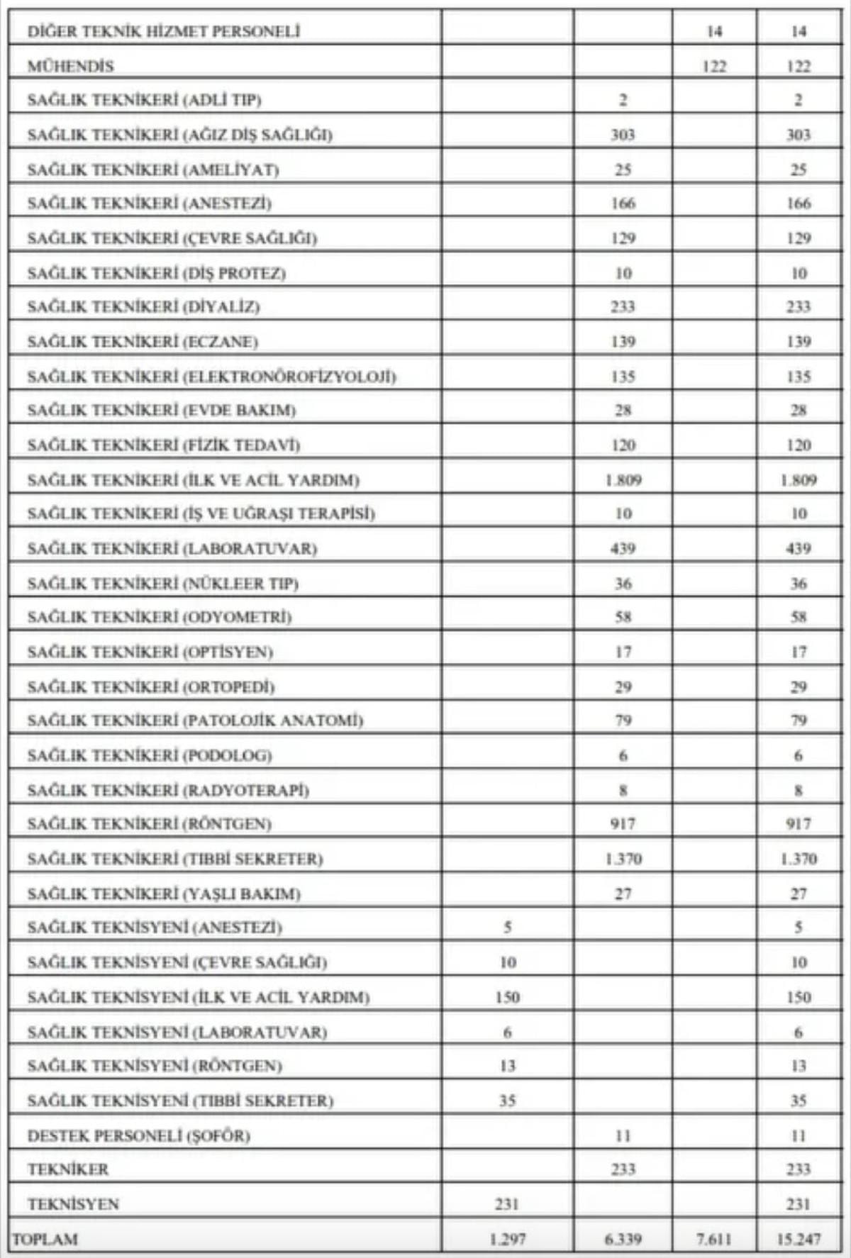 Bakanlığın alım yapacağı kadrolar da açıklandı. Buna göre toplam 15 bin 247 sözleşmeli personel için kadro dağılımı şu şekilde olacak: