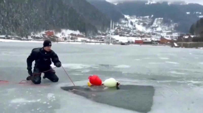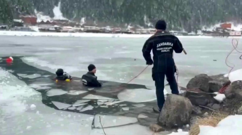 Trabzon İl Jandarma Komutanlığı'na bağlı Sualtı Arama Kurtarma Timi, Uzungöl'de zorlu doğa koşullarında "İrtifa, Buz Altı ve Soğuk Su Dalışı" tatbikatı yaparak, sualtı kurtarma becerilerini güçlendirdi.