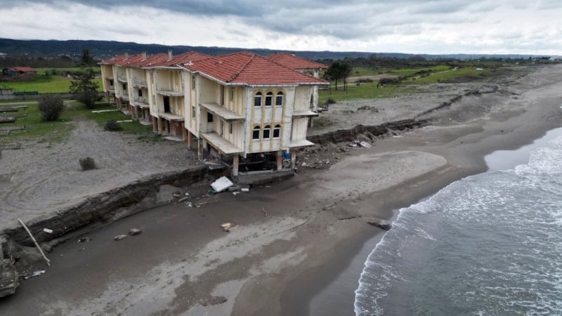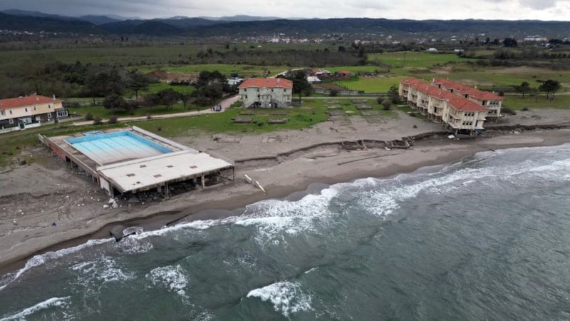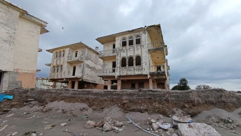 Karasu Sahili kıyısında bulunan eski tatil köyü alanında, dalgaların kıyıyı aşındırması sonucu villa ve havuzların büyük bölümü çöktü. Bir dönem denize yüzlerce metre mesafede bulunan yapıların bugün kıyı çizgisiyle neredeyse aynı seviyeye geldiği belirtildi.