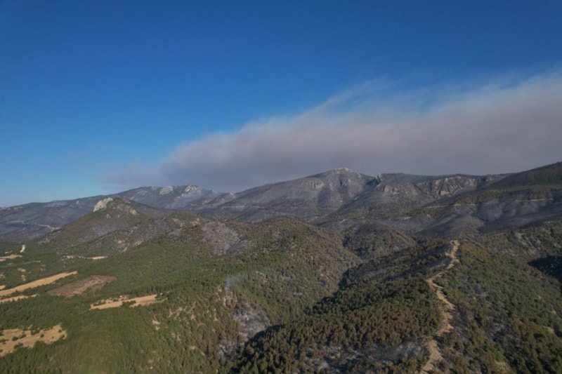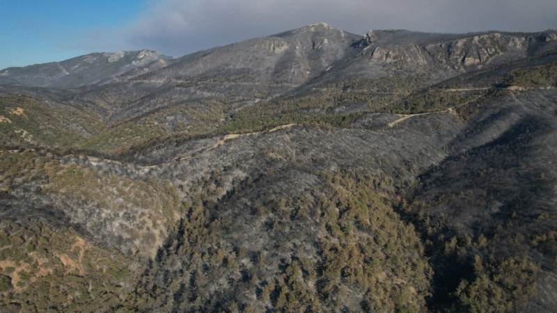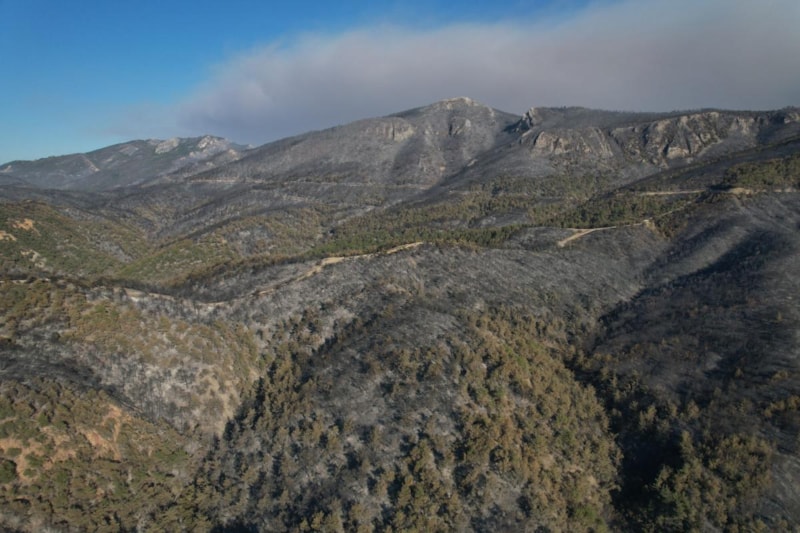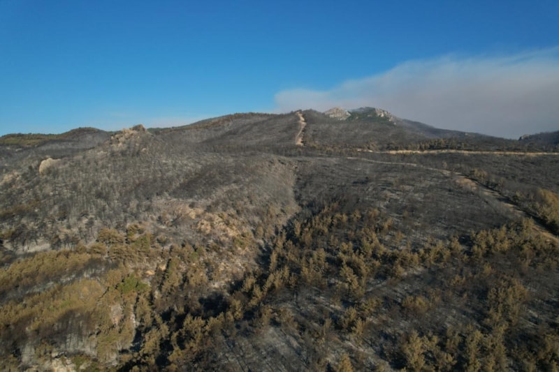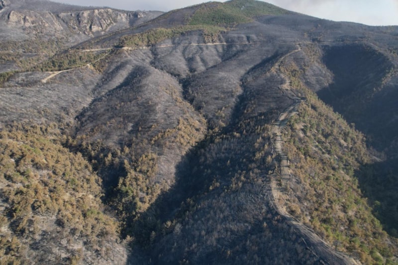 Ekipler yangınla mücadelesini sürdürürken, ormanlık alanın bazı bölgelerinde küle dönen alanlar havadan görüntülendi..