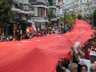 Yaklaşık 20 bin kişi dev bayrağın altında sloganlar atarak şehrin caddelerini dolaştı. Bayrak daha sonra açıldığı yerde tekrar toplanmaya başladı. FETÖ'nün darbe girişimine tepki amacıyla "Aynı Bayrak Altında" sloganıyla düzenlenen bayrak açma törenine AK Parti, CHP, MHP, Saadet Partisi, BBP de destek verdi.