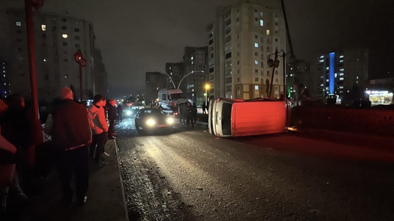 Çarpmanın etkisiyle minibüs yola devrildi. Meydana gelen kazada 5 kişi yaralandı.