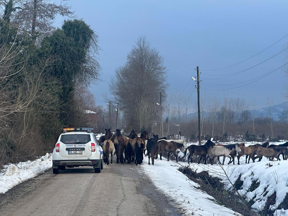 Şehrin farklı noktalarından gelen başıboş at ihbarı üzerine harekete geçen Terme Belediyesi Zabıta Müdürlüğü ekipleri kısa sürede atların yerini ve sahibinin kimliğini tespit etti.