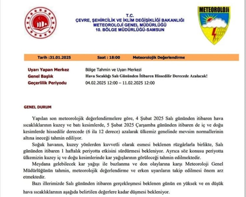 "Samsun'da salı gününden itibaren gerçekleşmesi beklenen günün en yüksek ve en düşük hava sıcaklıklarının 6/5 derece olması bekleniyor. Soğuk havanın kuzey yönlerden kuvvetli olarak esmesi beklenen rüzgârlarla birlikte salı gününden itibaren bir haftalık periyotta etkisini sürdürmesi bekleniyor. Söz konusu periyotta ülkemizin kuzey, iç ve doğu kesimlerinde kar yağışlarının görüleceği tahmin edilmektedir. Meydana gelebilecek kar yağışı ile buzlanma ve don olaylarına karşı Meteoroloji Genel Müdürlüğünün tahmin, meteorolojik değerlendirme ve erken uyarılarının takip edilmesi önem arz etmektedir"