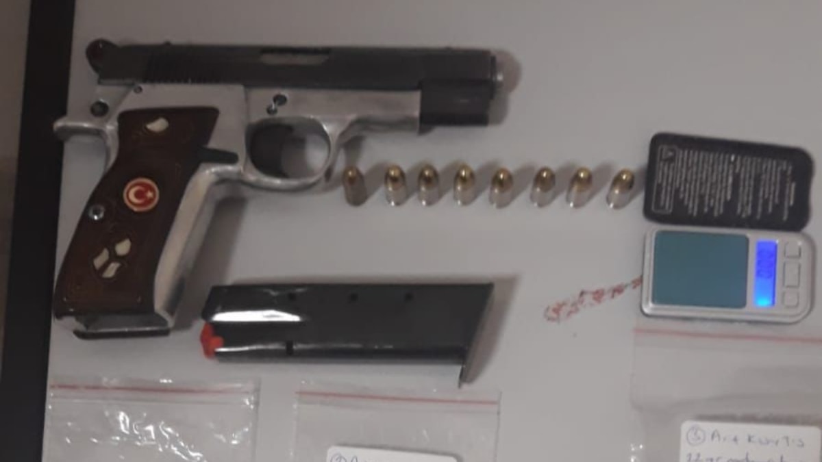 Yapılan aramalarda, 840 adet sentetik, za ve 30,25 gram metamfetamin, 1 adet hassas terazi, 1 adet ruhsatsız tabanca ve 8 adet tabanca fişeği ele geçirildi.
