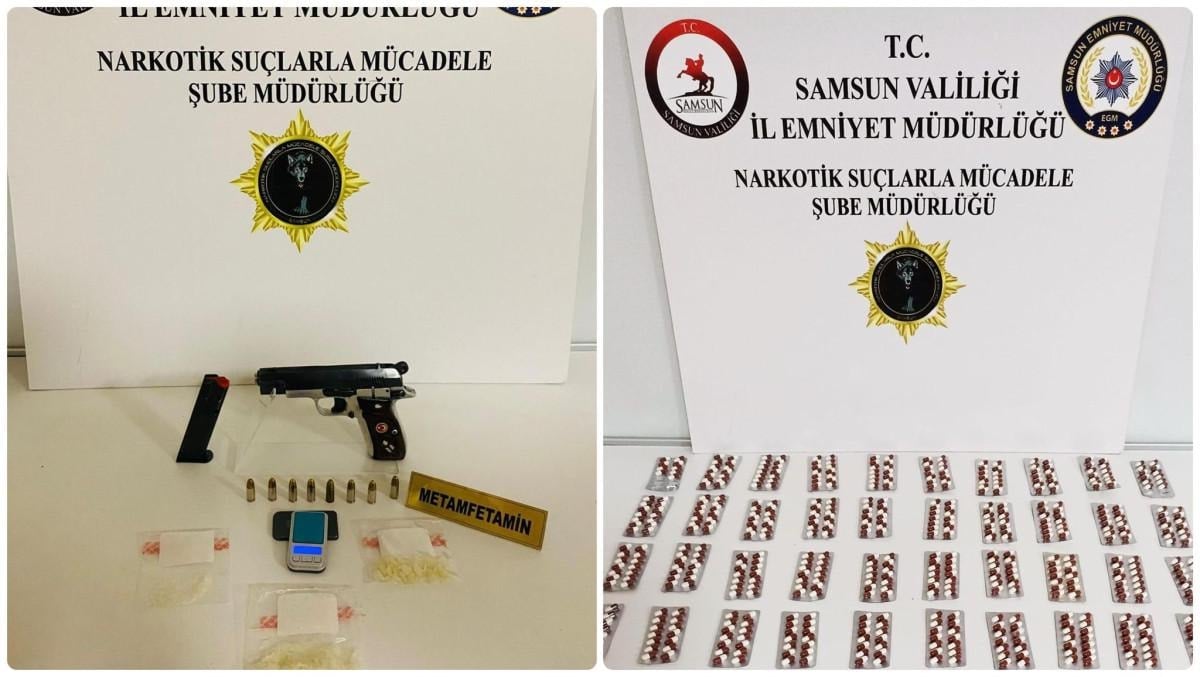 İlkadım ilçesinde A.K. isimli şahsın ikametinde yapılan aramada, 1 adet ruhsatsız tabanca ve 8 adet tabanca fişeği 30.25 gram metamfetamin maddesi ve 1 adet hassas terazi ele geçirildi. A.K. gözaltına alındı.