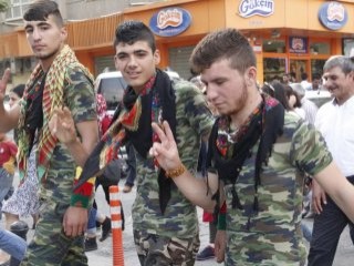 İmralı'da ömür boyu hapis cezası çeken Abdullah Öcalan üzerinde tecrit uygulandığını öne sürerek PKK flamaları ve Öcalan fotoğraflarıyla yürüyen grup, sık sık Öcalan lehine sloganlar attı.
