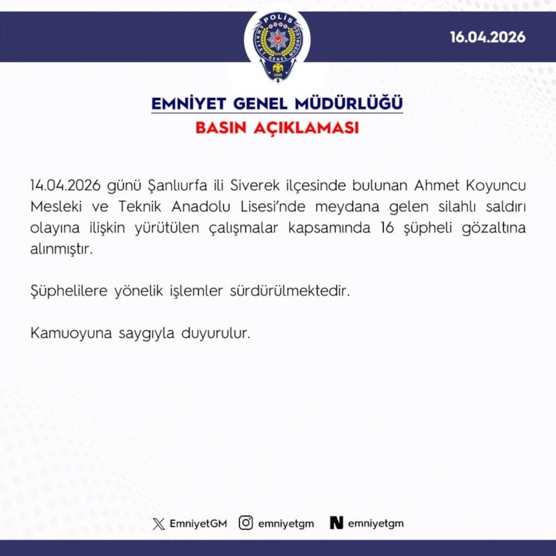 "14.04.2026 günü Şanlıurfa ili Siverek ilçesinde bulunan Ahmet Koyuncu Mesleki ve Teknik Anadolu Lisesi’nde meydana gelen silahlı saldırı olayına ilişkin yürütülen çalışmalar kapsamında 16 şüpheli gözaltına alınmıştır. Şüphelilere yönelik işlemler sürdürülmektedir"