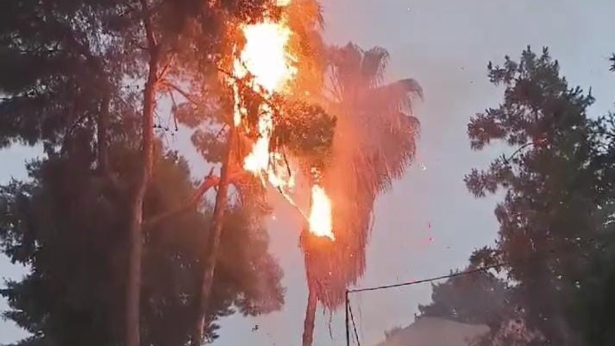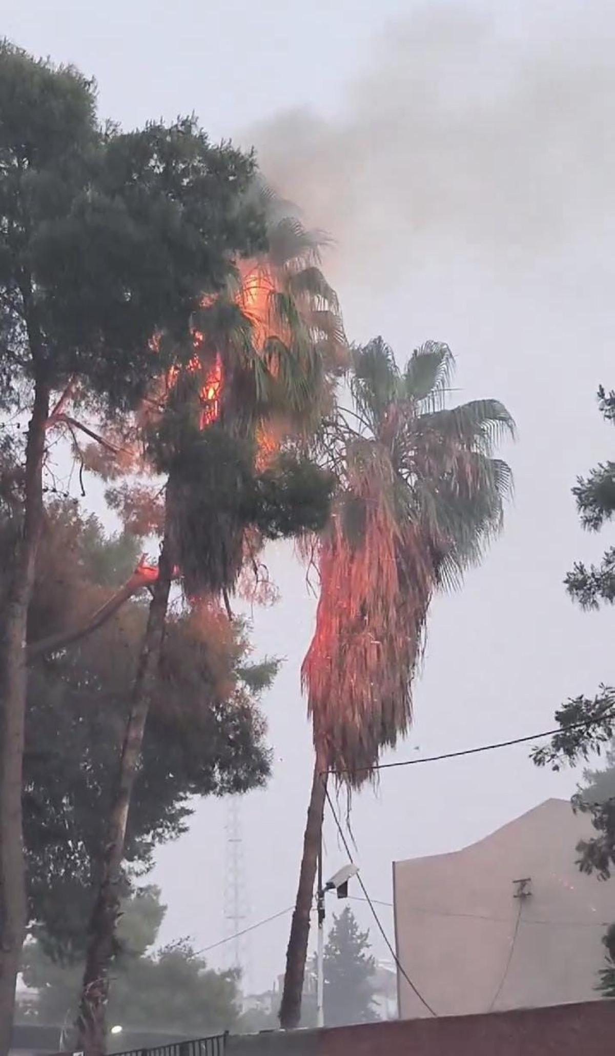 Şanlıurfa merkezde akşam saatlerinde şiddetli sağanak yağışla birlikte yıldırımın düştüğü bir palmiye ağacında yangın çıktı.
