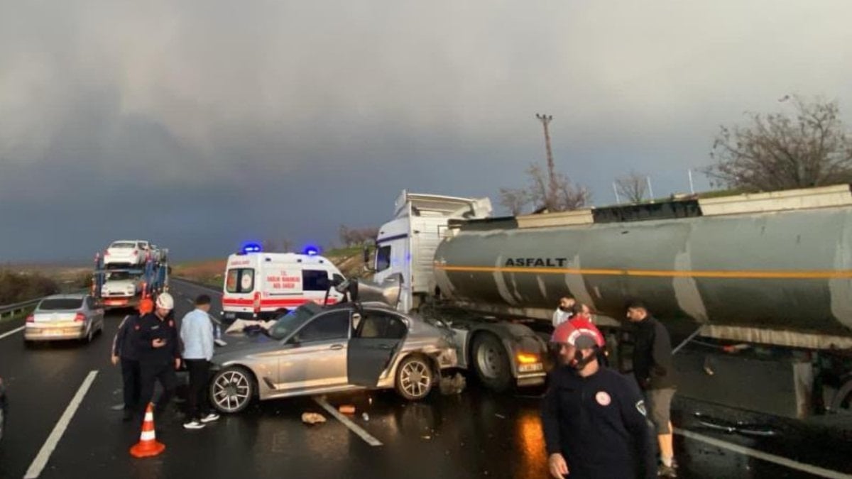Şanlıurfa'nın Birecik ilçesi Gaziantep-Şanlıurfa otoyolu üzerindeki Yuvacık Mahallesi yakınlarında sürücülerin isimleri öğrenilemeyen iki otomobil ile asfalt malzemesi yüklü tanker çarpıştı.