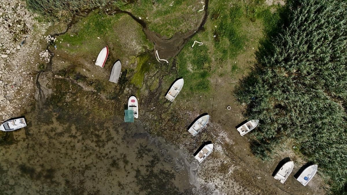 Göldeki suyun çekilmesi sonucu tarihi olduğu değerlendirilen taş kalıntılar ortaya çıktı, sandallar karaya oturdu.