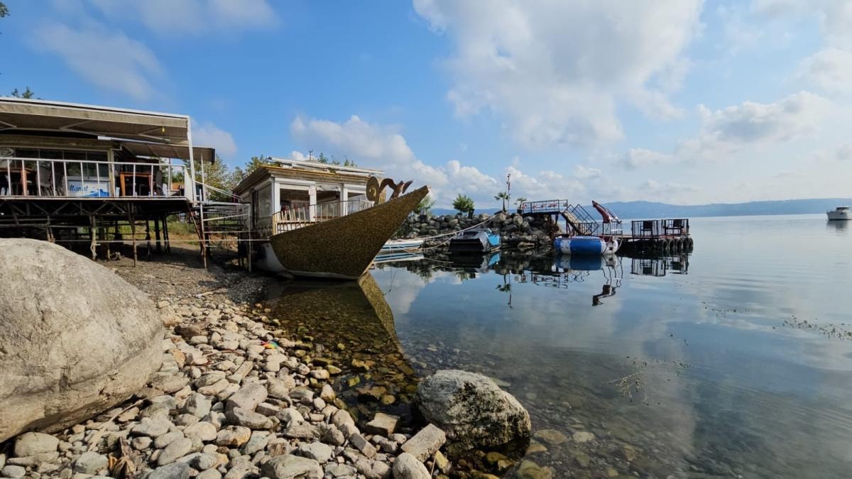 Göl kıyısındaki balık ekmek teknesi yaşanan çekilme nedeniyle karaya otururken, turistlerin kullandığı deniz bisikleti iskelesi de sahil seviyesinin altında kaldı.