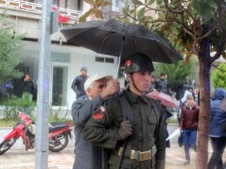 Öte yandan yağmur altında bekleyen bir askere, yaşlı bir adamın kendi şemsiyeni vererek yağmurdan koruması ise dikkat çekti.