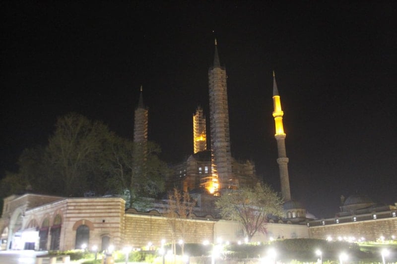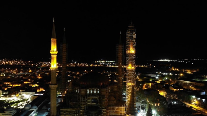 Restorasyon çalışmaları süren Mimar Sinan’ın şaheseri Selimiye Camii’nin ibadete açık olan bölümünde dini görevlerini yerine getirmek için akın eden vatandaşlar, ramazanın son teravih namazında saf tuttu.