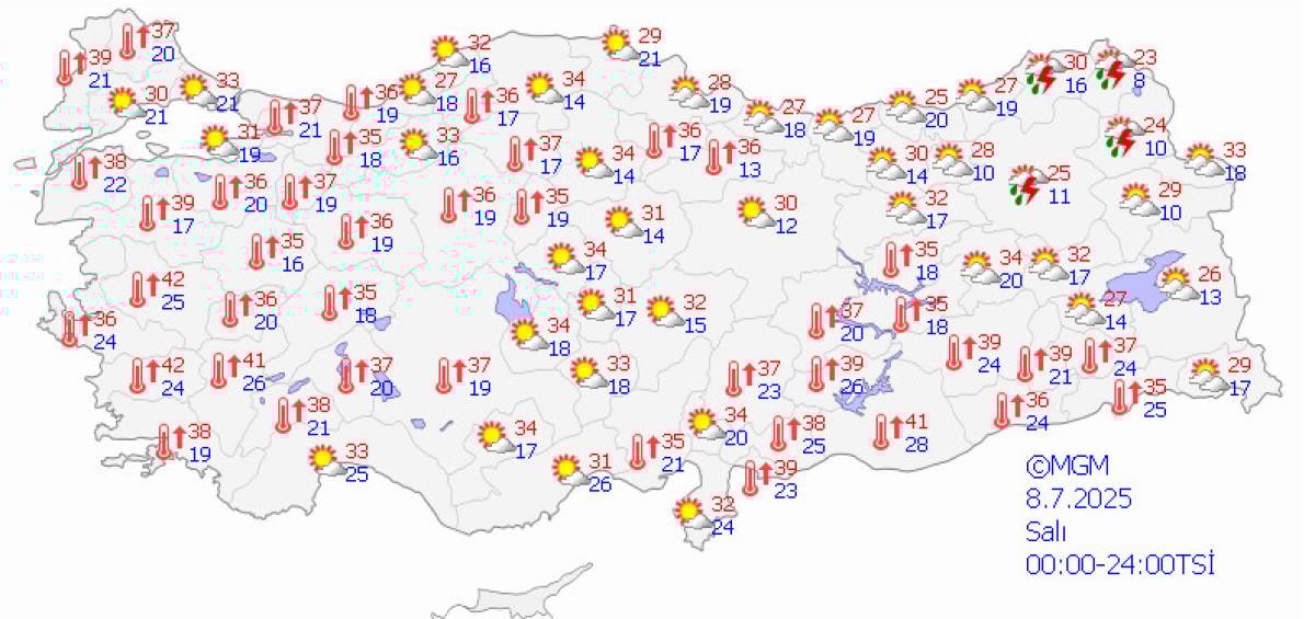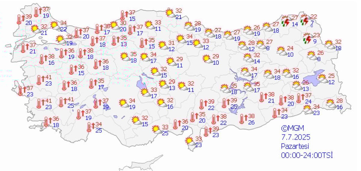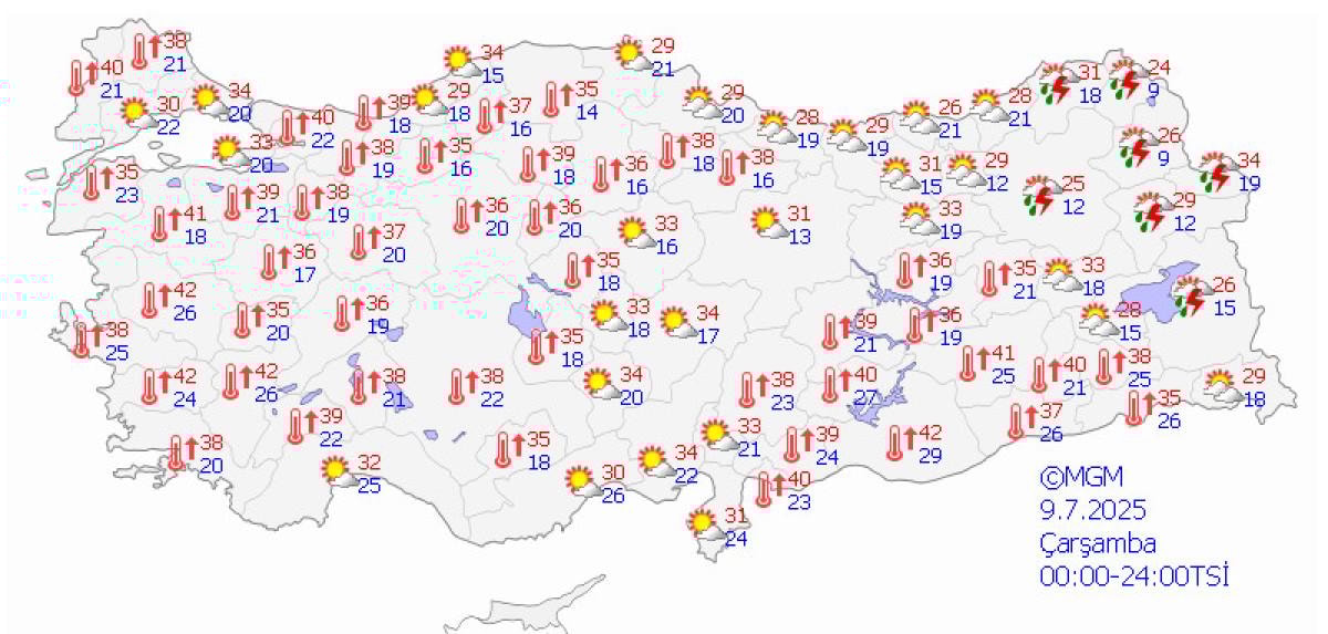 Meteoroloji Genel Müdürlüğü tarafından yapılan son meteorolojik değerlendirmelere göre; iç ve doğu kesimlerinde mevsim normalleri altında, diğer yerlerde mevsim normalleri civarında seyreden hava sıcaklıklarının, 5 Temmuz 2025 Cumartesi günü batı kesimlerden başlayarak artacağı, iç kesimler başta olmak üzere yurt genelinde mevsim normallerinin 4 ilâ 6 derece üzerine çıkacağı tahmin edilmektedir.